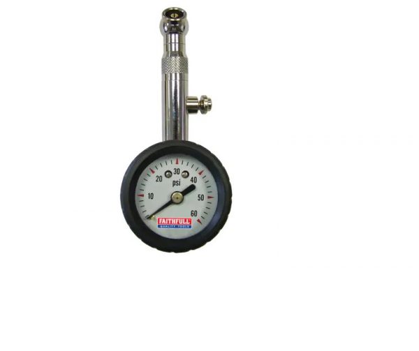 The Faithfull Tyre Pressure Dial Gauge is an easy-to-use, manual tyre pressure gauge for use with Schrader valves as fitted to all automotive tyres, it provides an instant reading of tyre pressure up to a maximum of 60 psi. The gauge features a 45° angled chuck for easy connection to the tyre and will retain the current reading when removed from the valve.