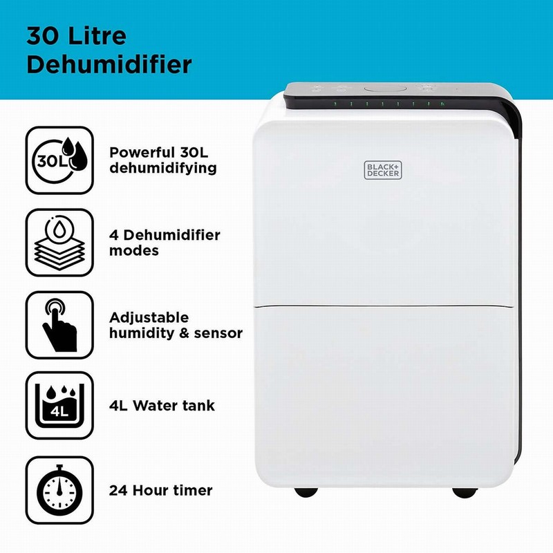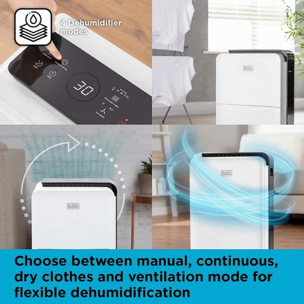 Introducing the BLACK+DECKER High-Performance Dehumidifier, your ultimate solution for maintaining optimal humidity levels in your home. Equipped with a digital humidity display, this innovative device effectively removes excess moisture from the air, preventing the formation of mold and promoting healthier indoor air quality.